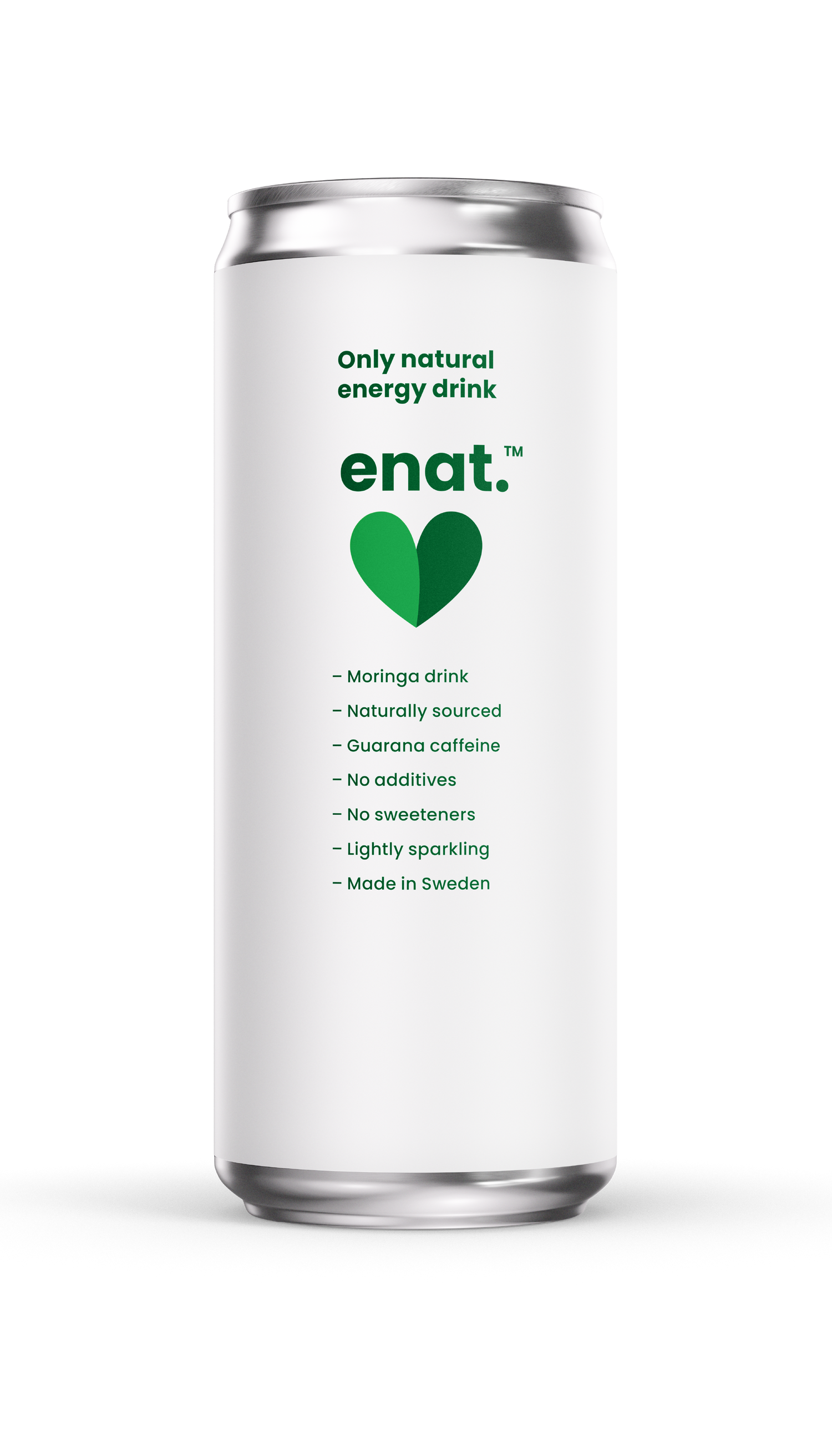 This is enat™, only natural energy drink. Enriched with the superfood Moringa, named 'the tree of life', due to its rich content of vitamins, minerals and iron. Brewed in Sweden, with no additives, all natural and fully traceable ingredients. Lightly sparkling with a fresh lemon ice tea flavour. Contains caffeine from the Guarana plant for extra energy, equivalent of 1,5 espresso. Please enjoy cold.